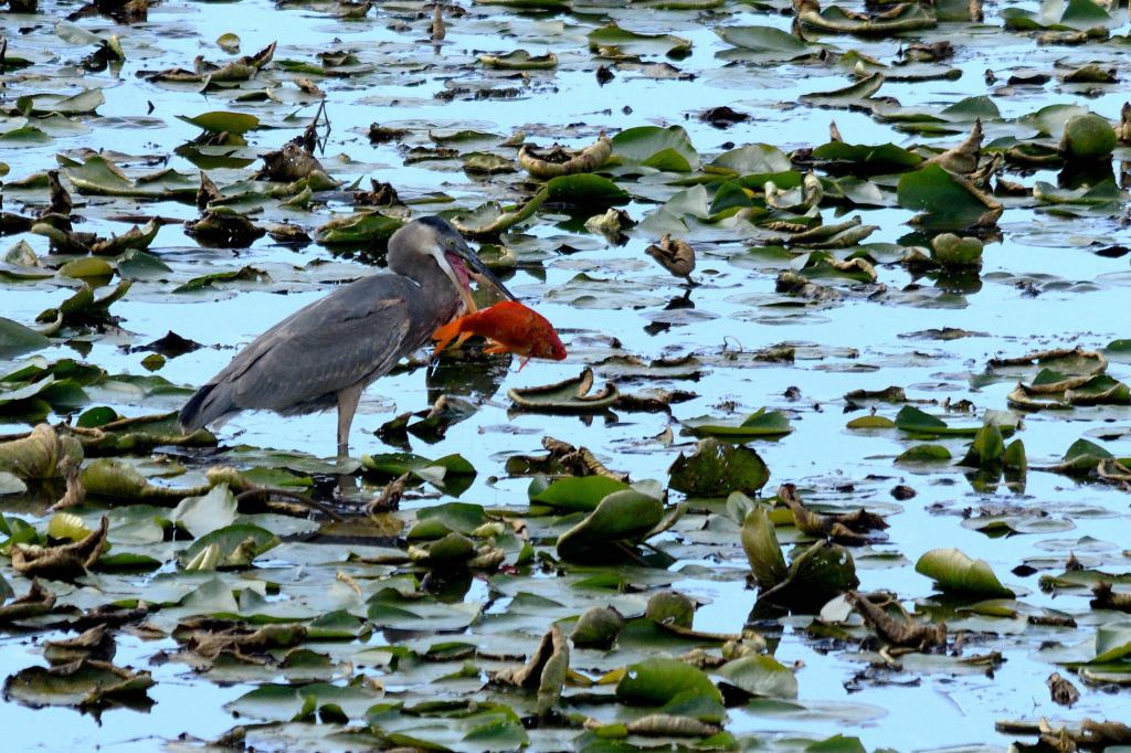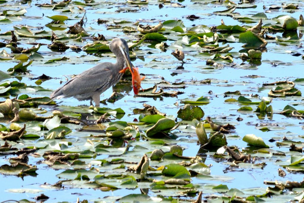 We see many things while standing on the tower. One day I happened to notice a Blue Heron who had caught a fish in the marsh. We have seen this before where the fish gets caught, the bird adjusts it in its beak and quickly swallows it. Fresh Sashimi to go.
