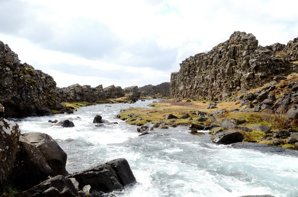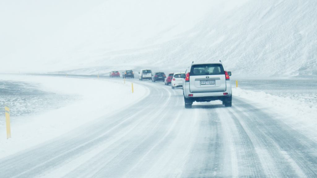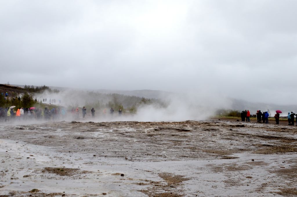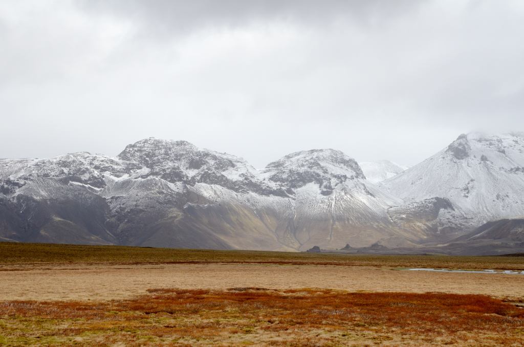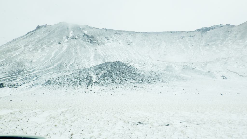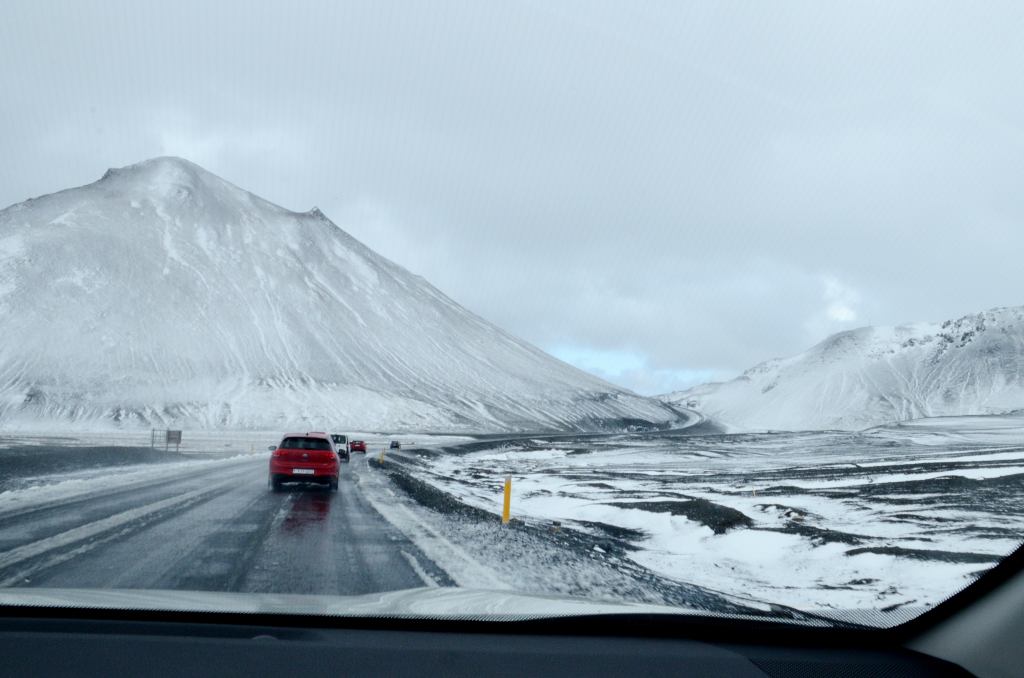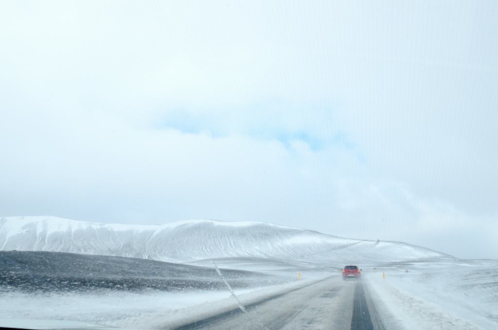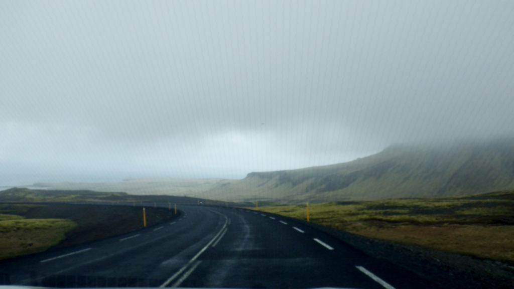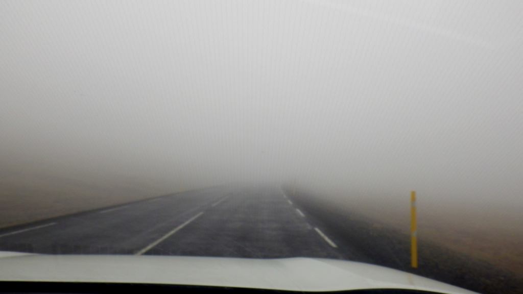 Little did we know that Iceland still had some tricks up her sleeve as we climbed higher into and over the mountains. Fortunately it wasn’t a blizzard this time, but blinding fog. We could see it early on and I kept trying to keep that ominous feeling in my stomach a little quiet. Sadly our hopes didn’t pan out and we were soon enveloped in fog so thick you could just barely see the yellow road marker at the side of the road ahead of us.