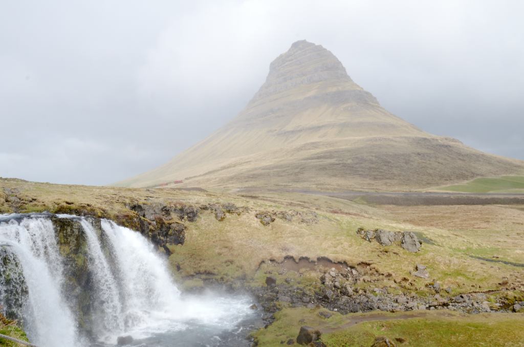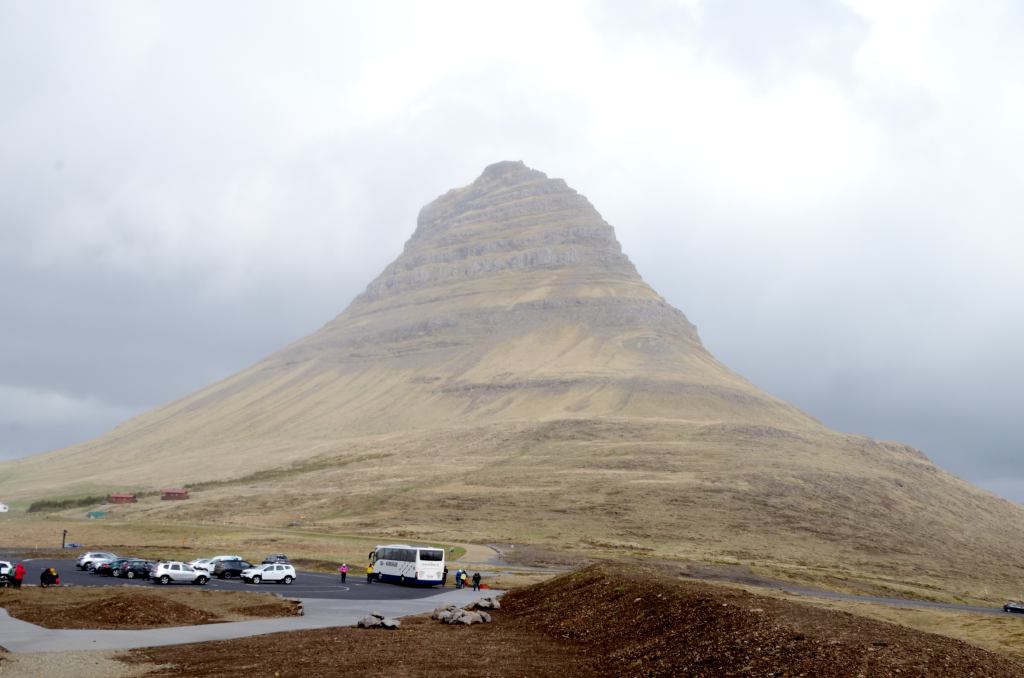 Suddenly there was the semblance of a mountain ahead of us, but I initially had no idea of where we were until I saw a parking lot to the right side, and a sign saying Kirkjufellsfoss and the lightbulb went on. We were here.
