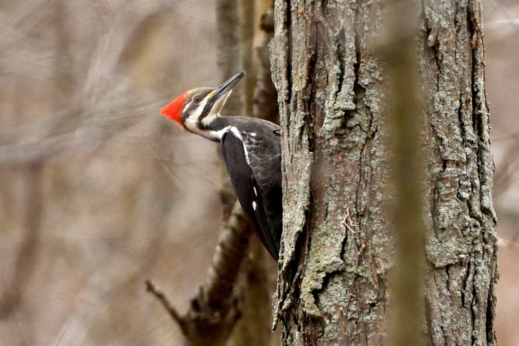 My Lady and I went to a nearby Provincial Park in early March and as we were walking along the road a dark streak flew in front of us and landed in a tree. I got my binoculars on it and we were thrilled to see a Pileated Woodpecker! We hadn’t seen one since before we left Toronto, and although we hear of one visiting the area once in a while, we were never in the right place at the right time.
