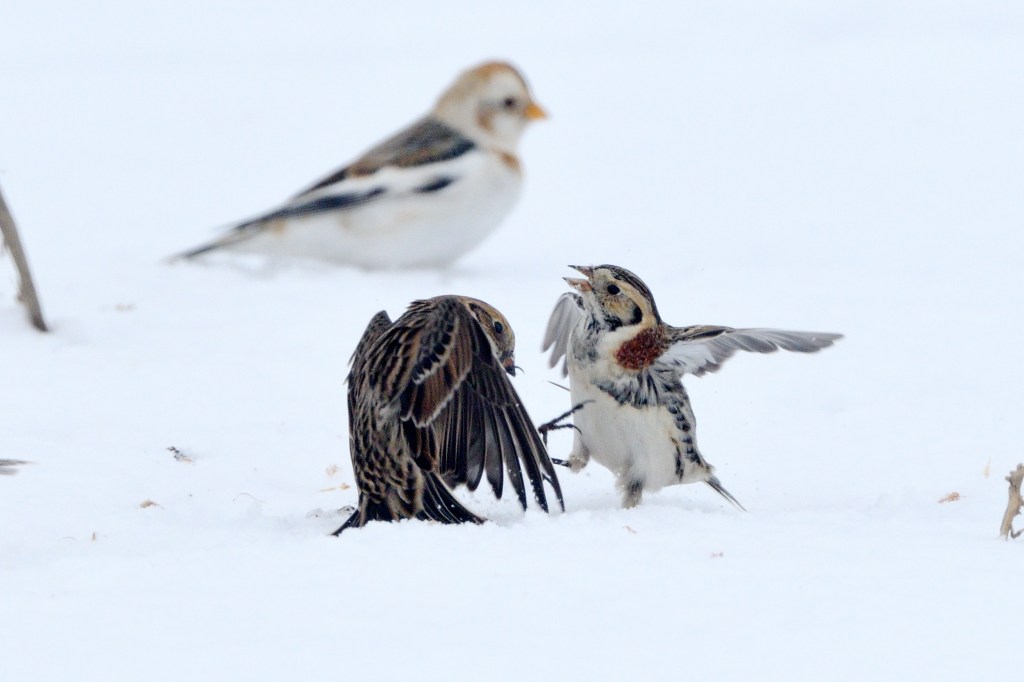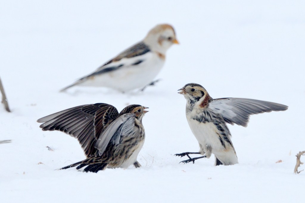 Snow BuntingSnow BuntingHorned LarkLapland LongspurSnow BuntingFight Fight FightGet Outta Here!I’m GoneAnother FightKung Fu FightingOoofThat’s Right, I Win!Aieeee!I am Super Bunt! I fight for Justice!That was all very interesting.Snow Buntings in flightHouse FinchesCardinalDuck Duck DuckNuthatchDark Eyed JuncoDark Eyed Junco
