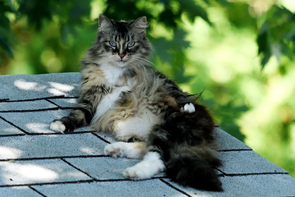 The neighbours cat often walks across our back fence (along the catwalk), and jumps up onto their garage roof. I was lucky one day as I got this photo of it grooming itself, kind of looking like a Playboy model.