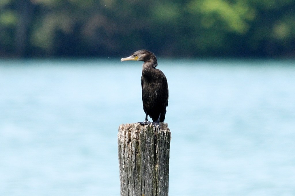 One bird that did show up on our radar and was being seen just around the corner from us, was a Neotropic Cormorant. We went out to try to find it and hope that I got a picture of it. The problem is trying to identify special markings on a black bird, from a good distance away. Binoculars couldn’t figure it out, but a heavy crop on a long lens does show what we hope is the differentiator. In the photo you can barely see a white line on its cheek, and the yellow patch under the eye stops there. In the Double Crested Cormorant which is the most common seen around here, they don’t have the white line that goes up the same way, and the yellow on the face goes further back.